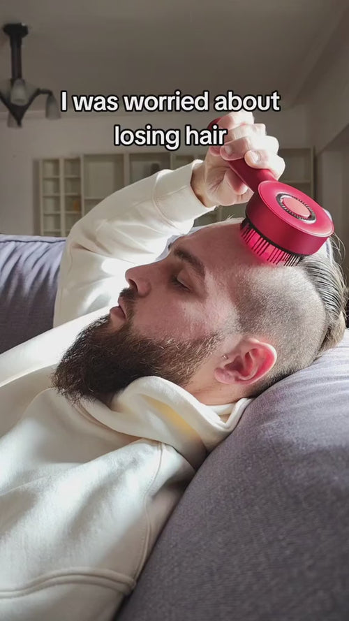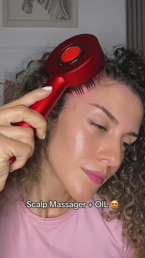 The Vibration Massage Comb is a scalp massager that uses LED red light therapy and gentle vibrations to stimulate blood flow, promote hair growth, and improve scalp health.